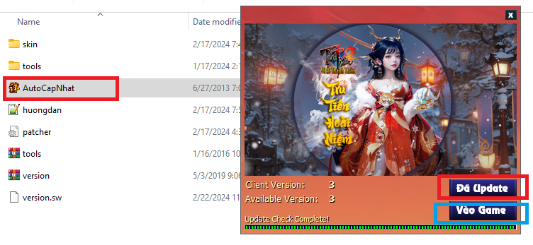 Bước 3: Sau khi giải nén sẽ được thư mục TruTien2_RemakeTuoiTho vào thư mục này -> vào patcher chạy file Patcher.exe (Máy Chủ Tuổi Thơ 2 Remake) để cập nhật lên phiên bản mới nhất rồi vào game.